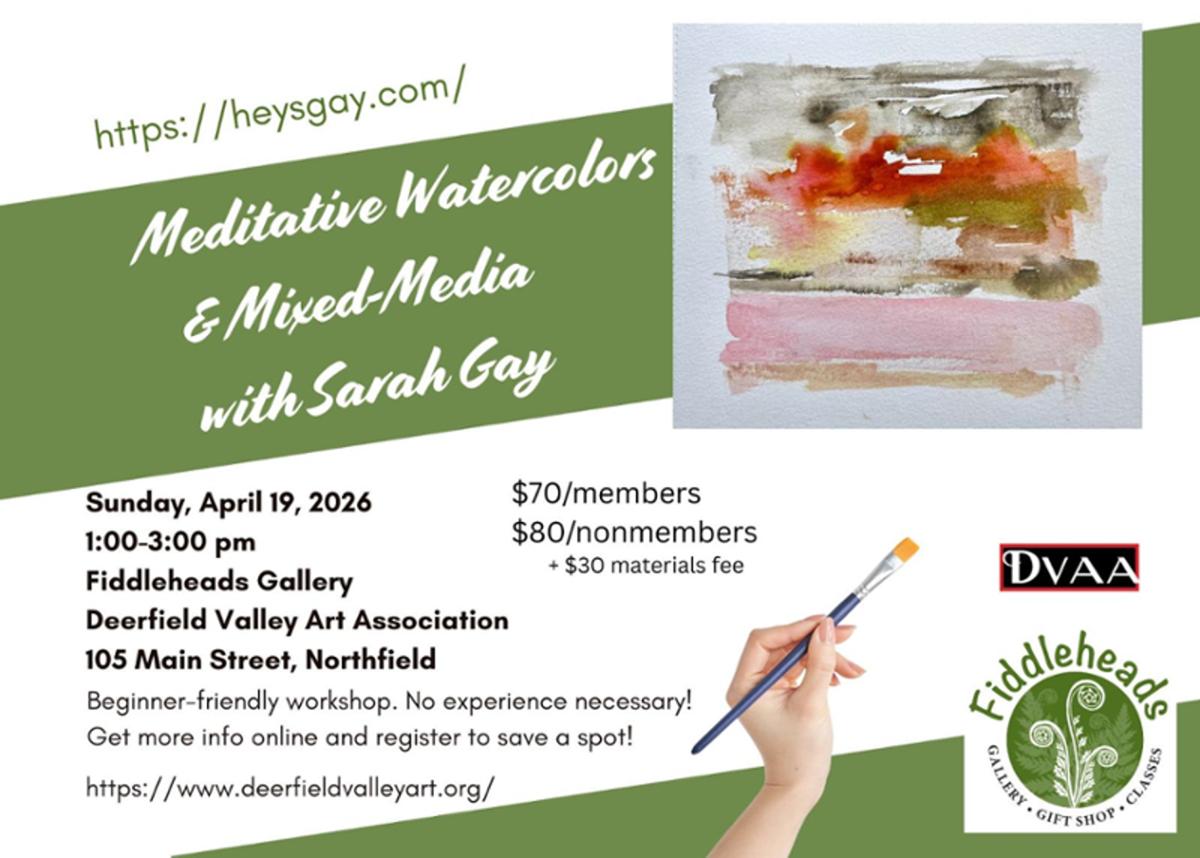 This mixed-media watercolor workshop invites participants to slow down, notice their breath, and explore mark-making with unexpected tools instead of traditional brushes. Using watercolor, ink, liquid charcoal, salt, oil pastel, and other unconventional materials, we’ll create layered abstract pieces while staying curious and open to surprising textures and unanticipated marks. The focus is less on producing a perfect painting and more on being present with the process—watching pigments bloom, spread, and interact while responding intuitively to what appears on the page. In the spirit of April, a month that asks us to patiently trust spring’s gradual unfolding, this workshop encourages artists to embrace experimentation and trust that beauty can emerge from the unexpected. Suitable for beginners and experienced artists alike.